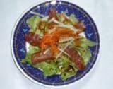 タレを作っておく、醤油にごま油少々、すりゴマを加えて混ぜておく。皿にちぎったレタスを敷き、その上にまぐろをのせ更に、千切にした大根、きゅうり、人参を彩りよくのせてタレを掛けて出来上がり。