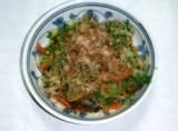 タレは、だし汁に醤油を合わせた物。野菜は、全て細切りにし茹でて水気を取るため絞っておく、器に絞った野菜を盛付けタレを掛け最後に上からかつお節をのせて出来上がり。