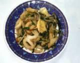 いり卵を作っておく、次にごま油で蓮根ちりめんじゃこと入り卵を炒める、高菜を加え醤油を入れて味を調え出来上がり。